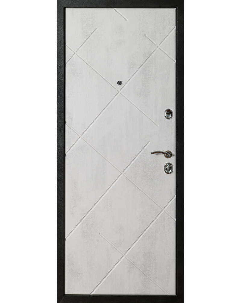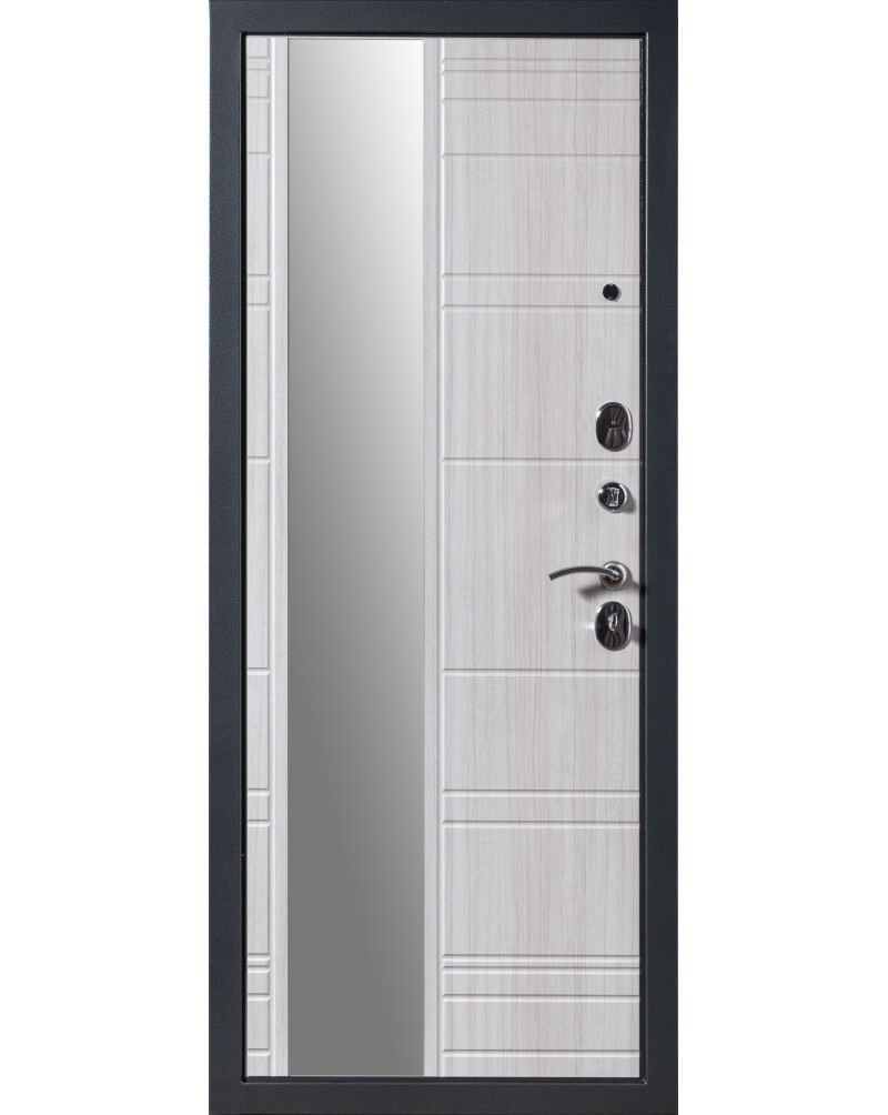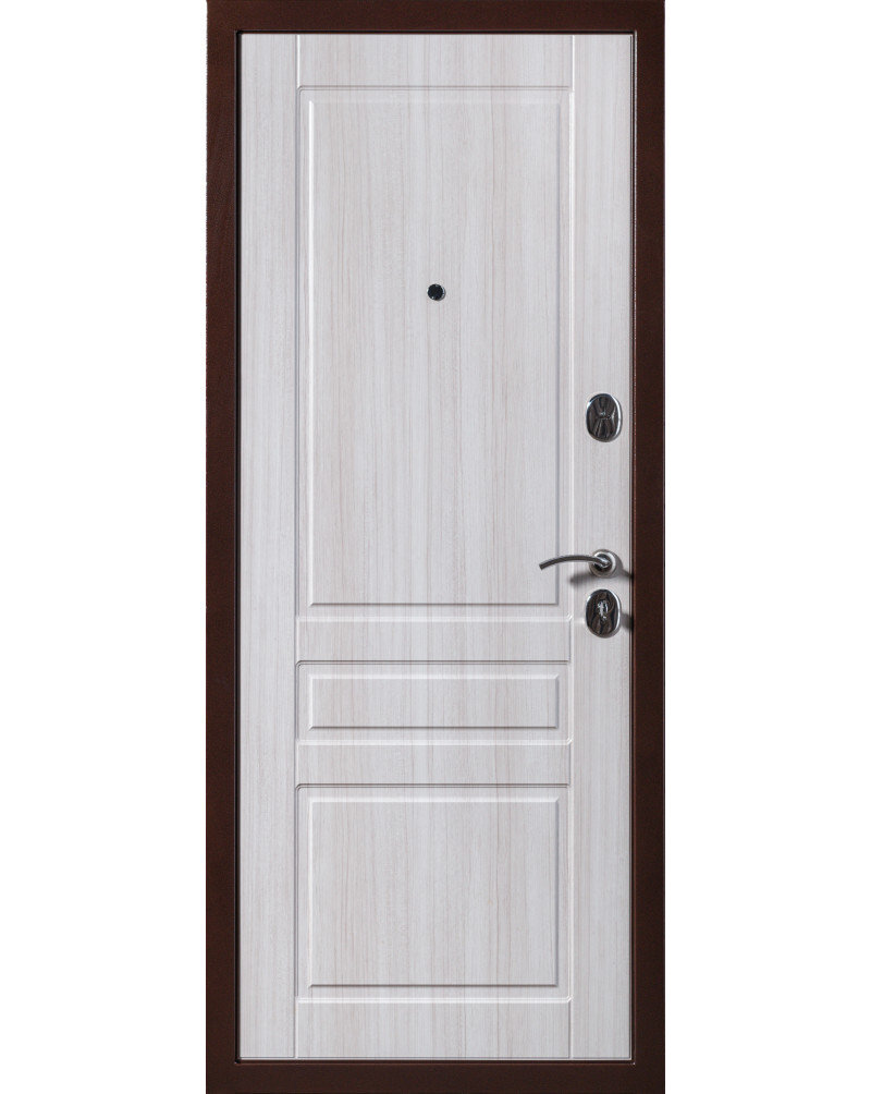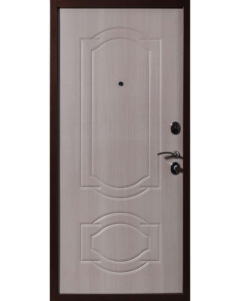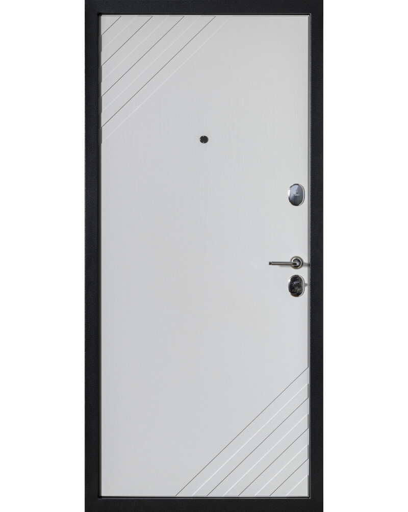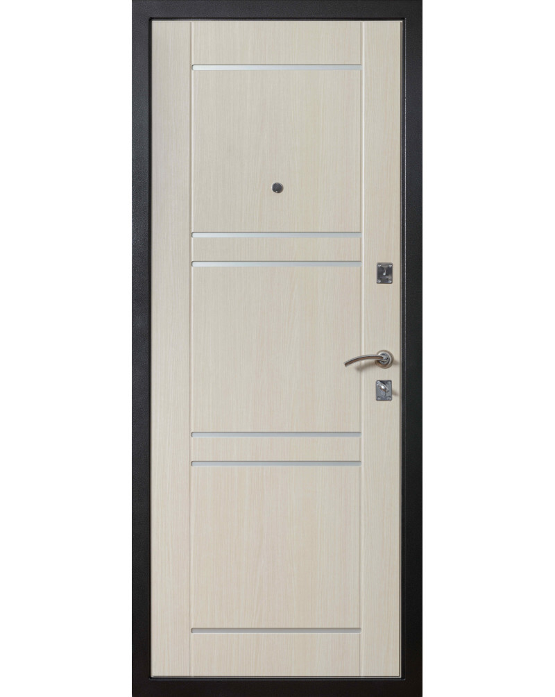 • Покрытие: внешняя сторона - порошково-полимерное, цвет “Антик серебро темное”, внутренняя сторона - фрезерованная МДФ панель 10 мм, цвет “Белое дерево” • Наполнение: Пенополистирол • Два контура уплотнения • Толщина полотна: 60 мм • Две петли • Цельногнутые короб и полотно, отсутствие сварных швов • Размеры: 860х2050 мм, 960х2050 мм Система безопасности: • Основной замок: врезной цилиндровый DF, эксцентрик