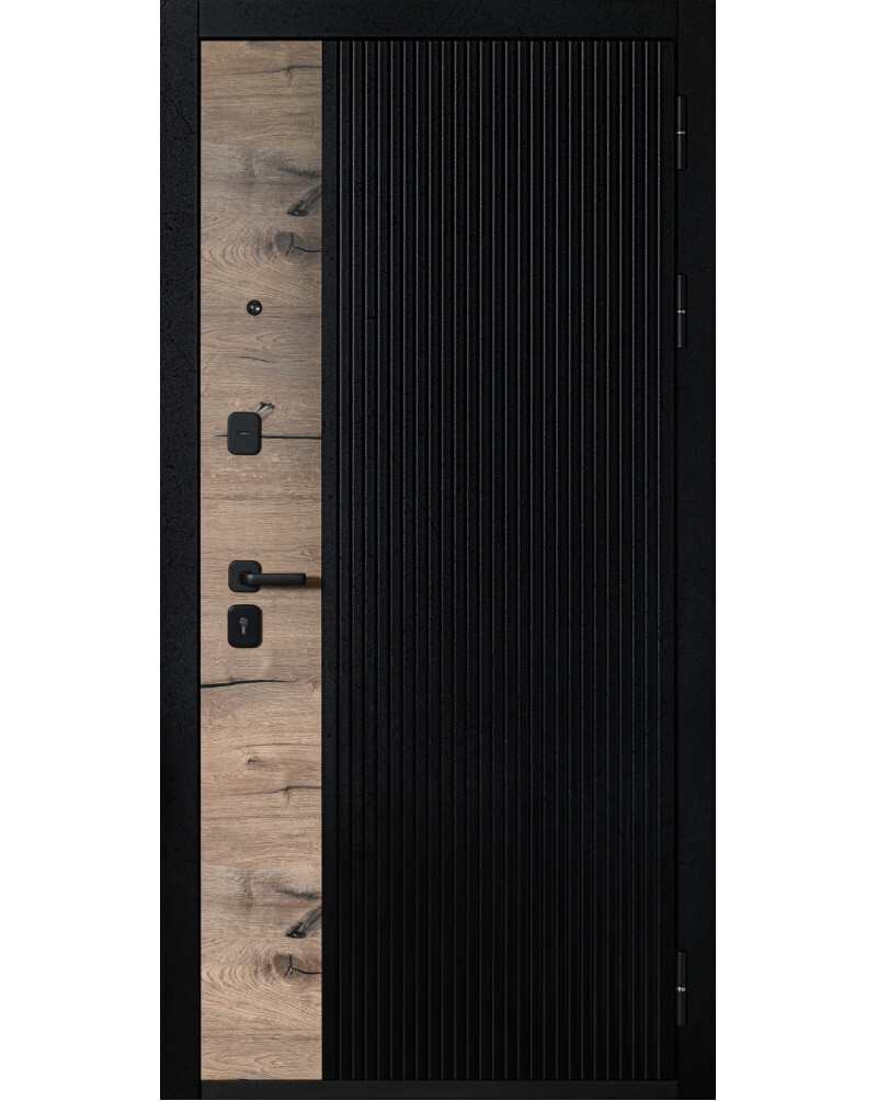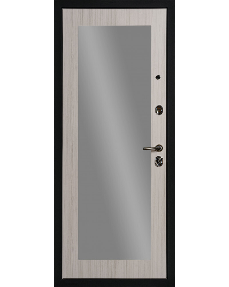 Покрытие: внешняя отделка: фрезерованная МДФ-панель цвета "Черный" толщиной 10 мм в комбинации с металлическим покрытием "Муар черный", внутренняя отделка: фрезерованная МДФ-панель с зеркалом, толщиной 10 мм в цвете "Сандал"